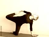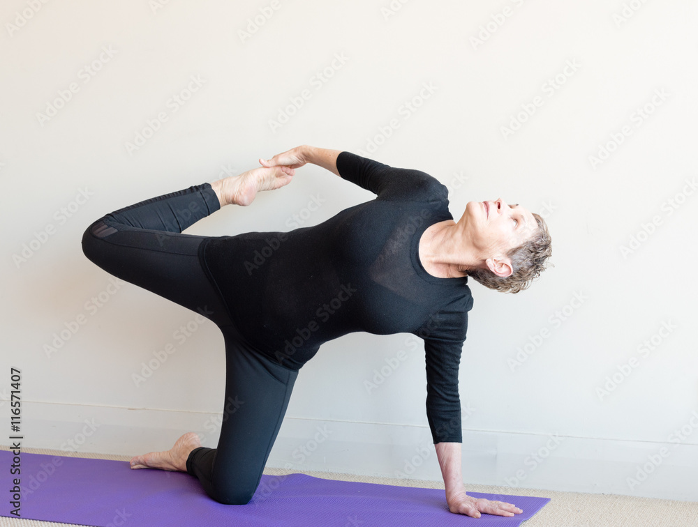 Older woman in black yoga clothing on purple mat in one handed tiger pose looking up