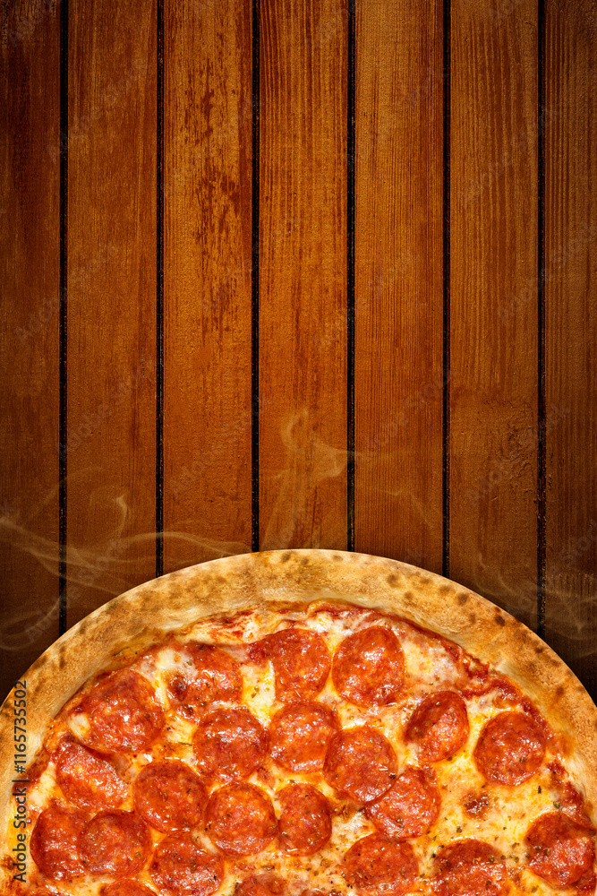 Pizza pepperoni top view vertical flyer. Hot Pizza salami and mozzarella cheese on wooden background for pizzeria banner. Flat lay. Copy space