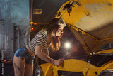 Woman mechanic in sexy shirts is repairing an old car with the w