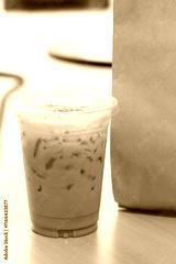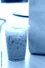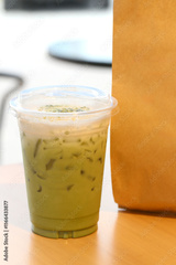 Refreshing Iced Matcha Latte in a Clear Cup with Straws Next to a Brown Paper Bag on a Wooden Table in a Bright Cafe Setting