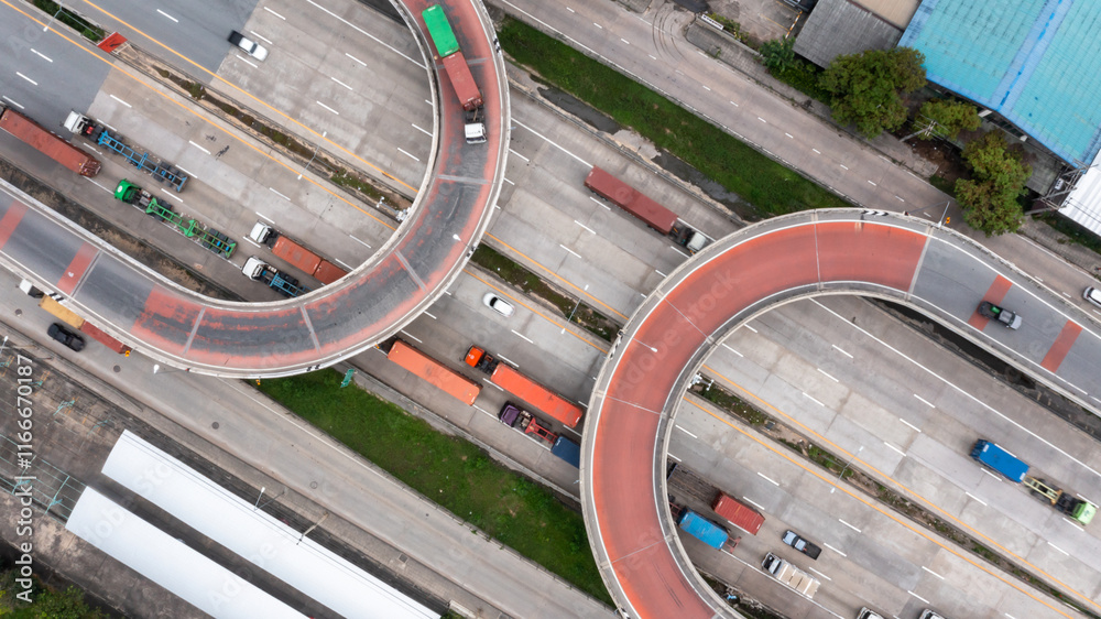 Aerial top view traffic junction road with car vehicle movement transportation, Highway multilevel junction road with car.