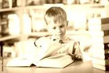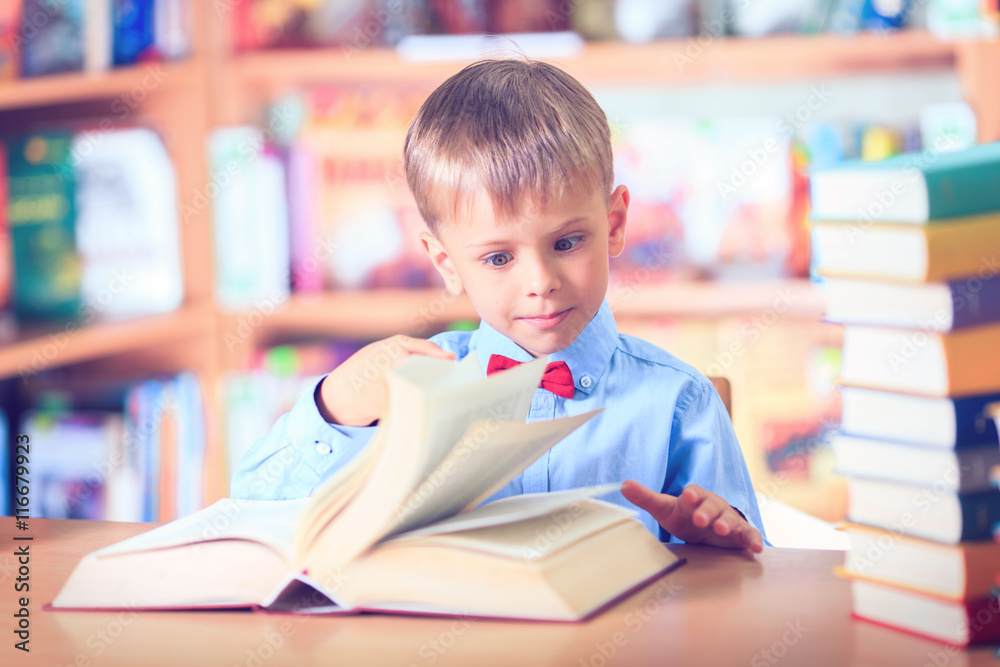 School Kid Studying in Library, Child Writing Paper Copy Book in