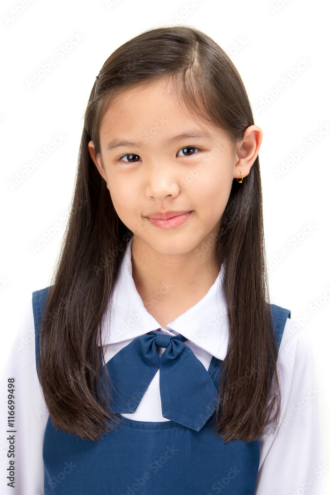 Portrait of asian child in school uniform on white background isolated