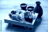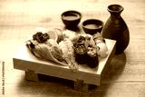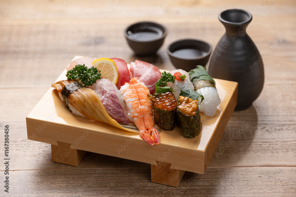 木目テーブルに映える寿司下駄の握り寿司セットと日本酒