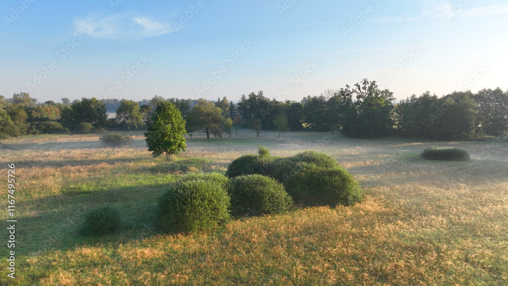 Meadow plain floodplain drone aerial Plane loucky fog morning over nature reserve, Litovelske Pomoravi protected landscape area, endangered species of plants, willows, virgin nature, Europe
