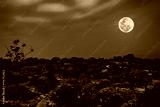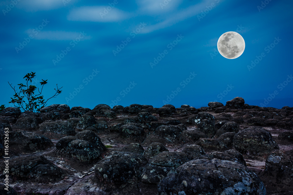 Rocky against blue sky and beautiful full moon at night. Outdoor