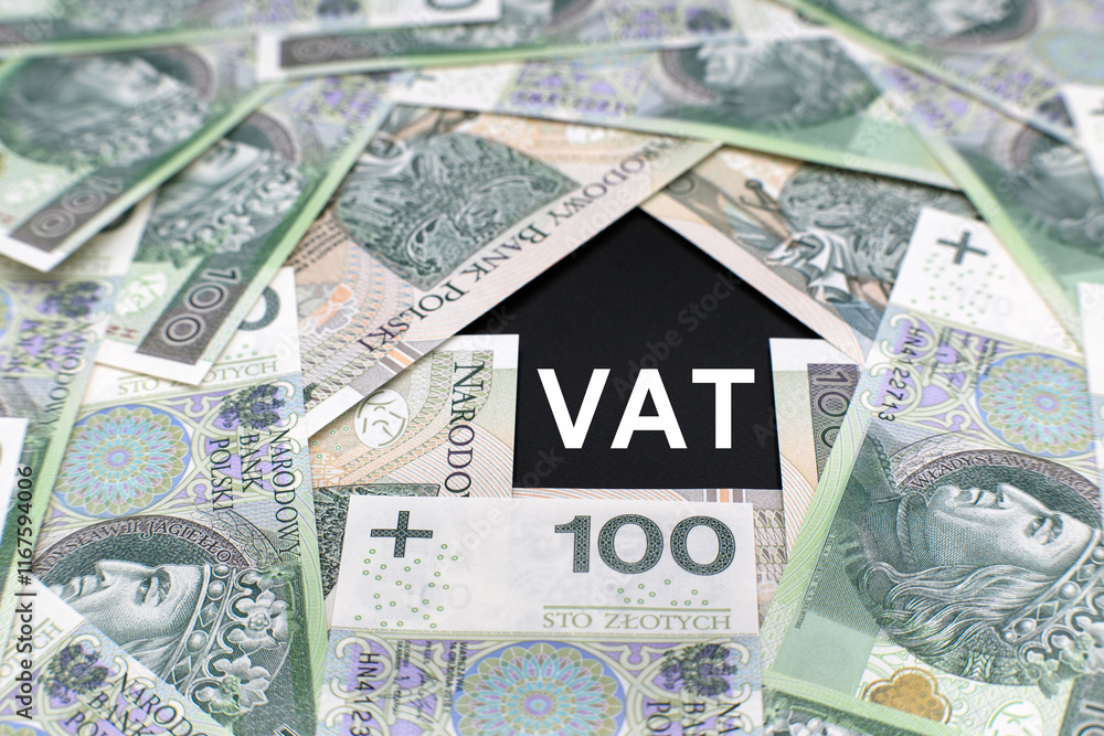 VAT inscription, house symbol, Polish money - hundred zloty.