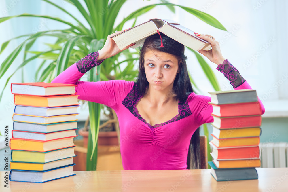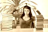 girl student with glasses reading books in the library