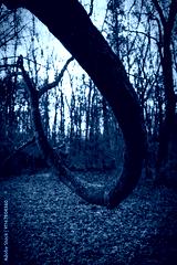 Curved Maple Tree Trunk and Branch over the Brown Fallen Leaves at East Rock Park in New Haven, Connecticut in Winter