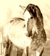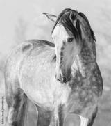 Spanish thoroughbred grey horse in winter forest.
