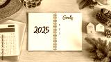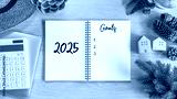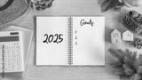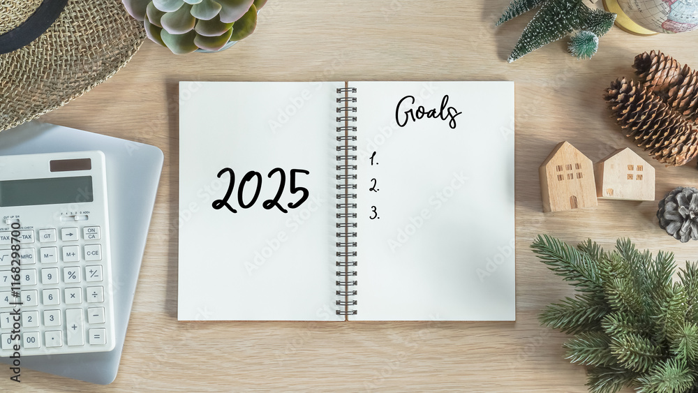 2025 goals new year resolutions on blank note book memo reminder wish list of yearly planner, action plan for work-life balance, good financial health, happy home family, travel aims on office desk