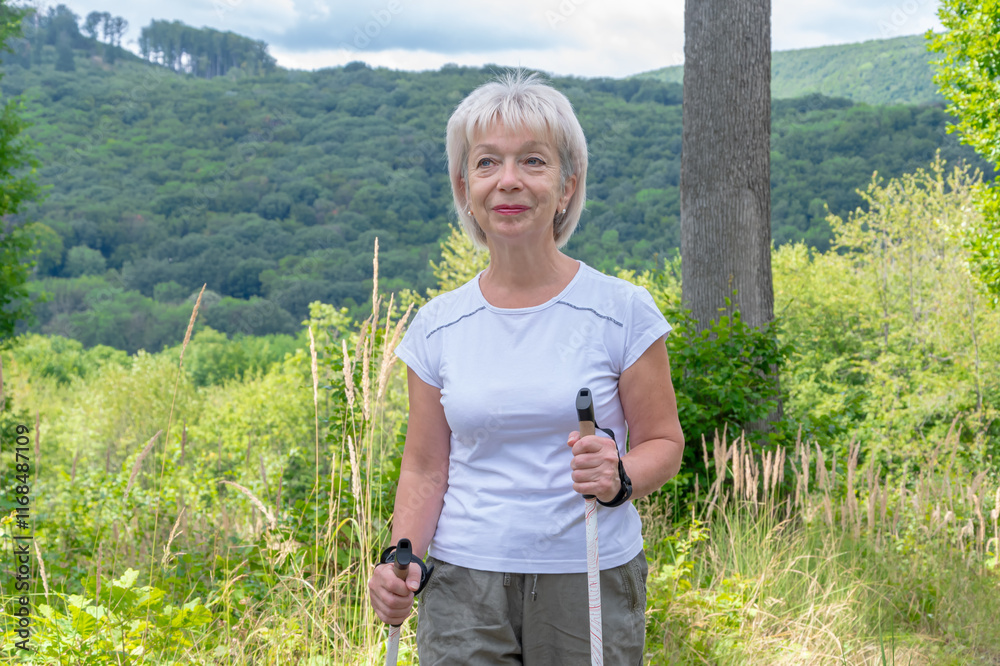 An elderly female traveller with trekking poles against a picturesque mountain landscape.