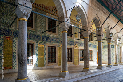 Turkiye. Istanbul. Topkapi palace. Iznik earthenware tiles adorning the walls of the Harem district