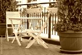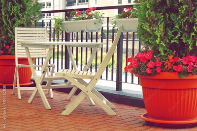 Balcony With Wooden Furniture And Decorative Small Garden.