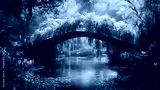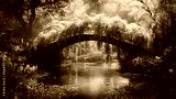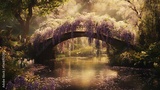 A dreamy scene of a small bridge covered in wisteria and surrounded by blooming flowers
