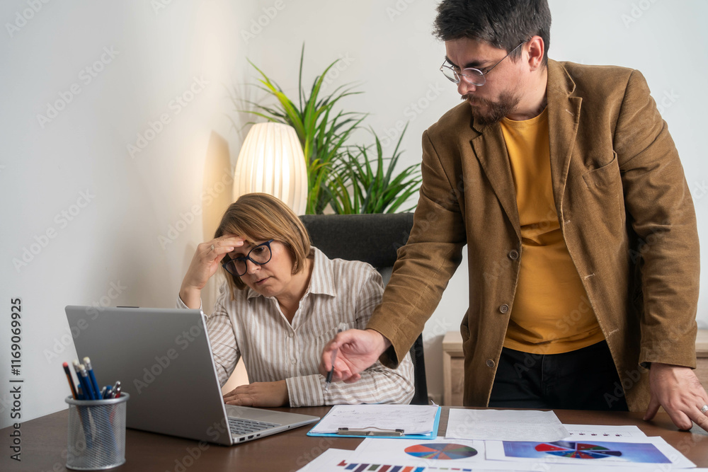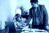 Conflicted office scene showing an angry male boss yelling at a frustrated female employee working on laptop. Tension highlights workplace stress and pressure during a business meeting.