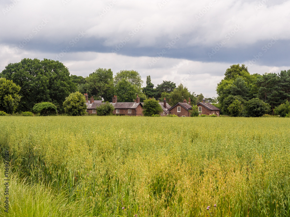 Styal, Cheshire, UK. July 26th 2016. Quintessential english cottages across crop field in Styal village on a cloudy summer day, Styal, Cheshire, UK