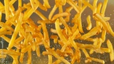 Freeze motion of flying french fries on gradient background