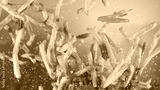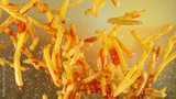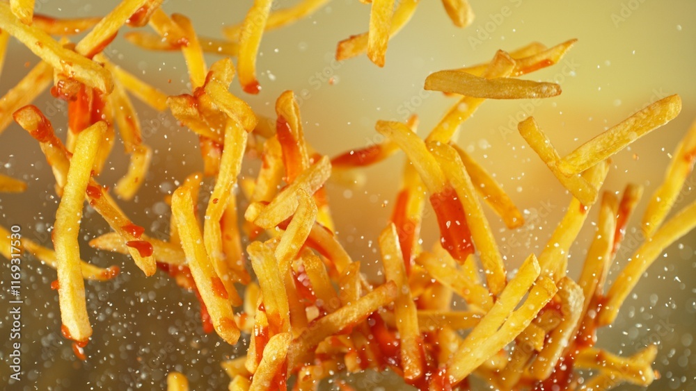 Freeze motion of flying french fries on gradient background