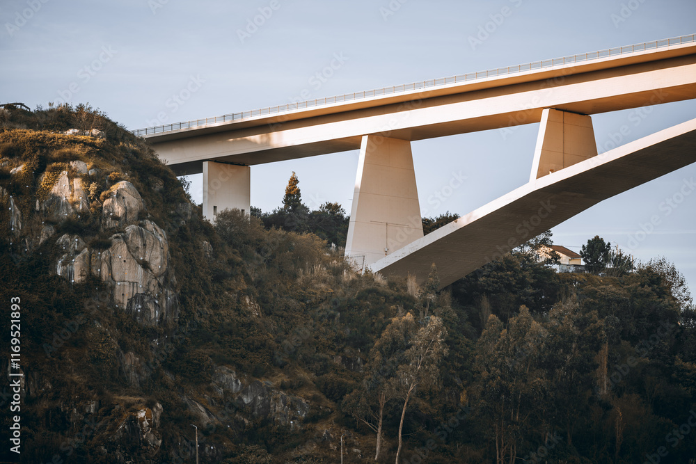 A modern concrete bridge spanning a lush green hillside with rocky formations and trees, illuminated by soft sunlight, showing the Ponte do Infante in Porto, Portugal