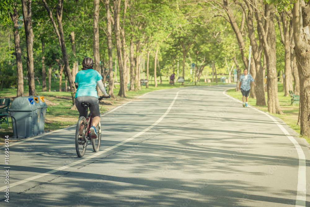 Woman biking park in Bangkok, Thailand. Cycling Fitness in public park.