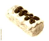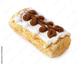 Delicious dessert with layers of cake, cream, and chocolate frosting topped with decorative swirls