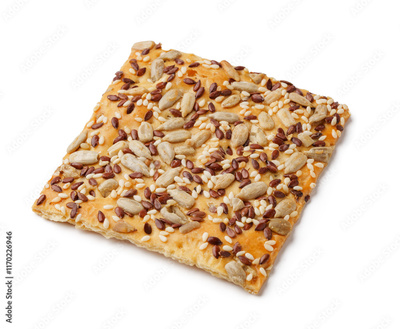 Snack featuring a crisp topped with peanut butter and seeds on a white background