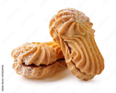 Deliciously shaped cookies stacked together with creamy filling and powdered sugar