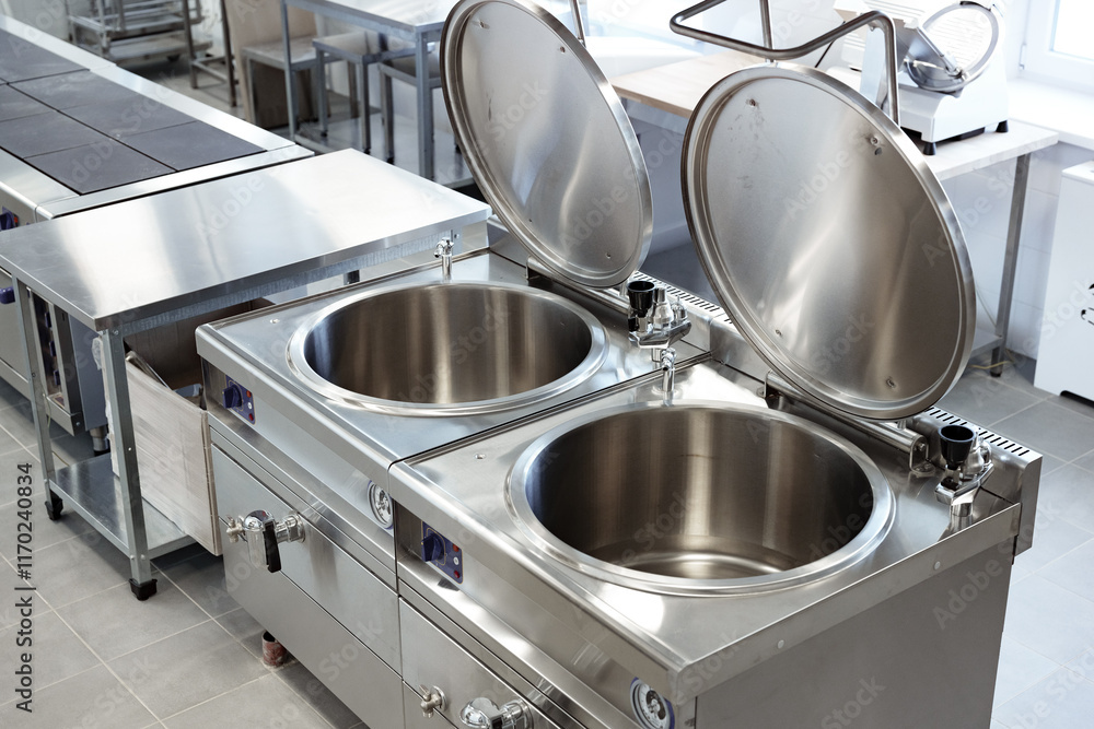 Stainless steel cooking equipment in a modern kitchen for meal preparation