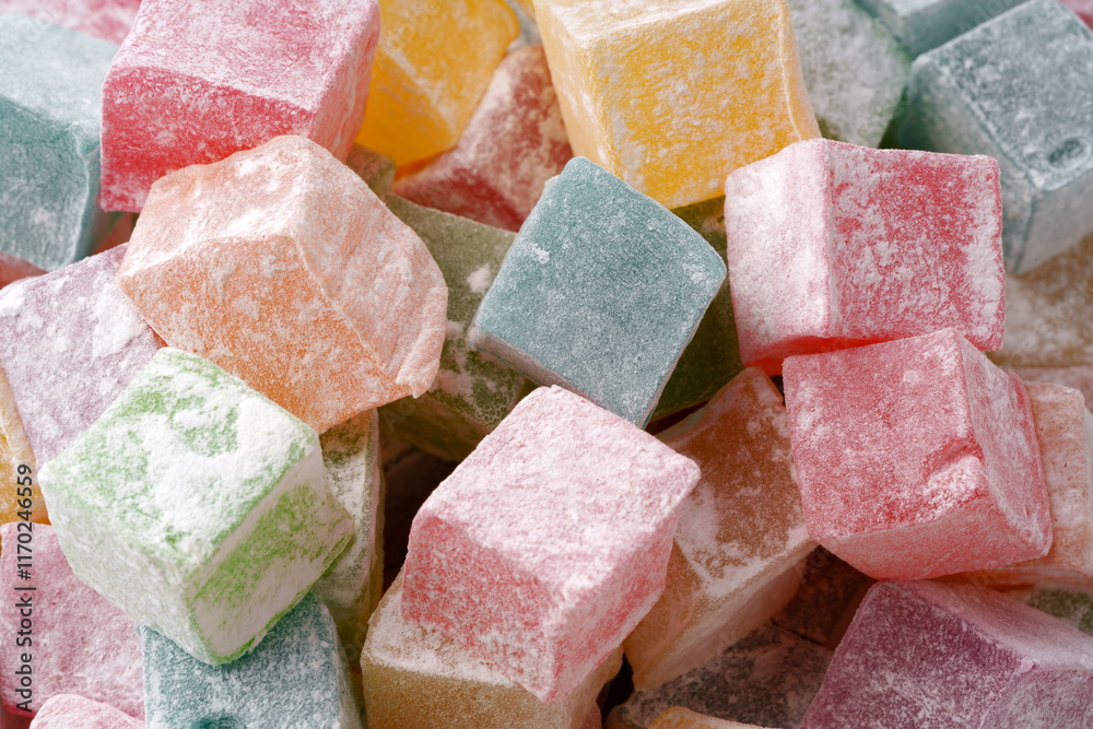 Colorful assorted Turkish delight cubes arranged in a tempting display for dessert lovers