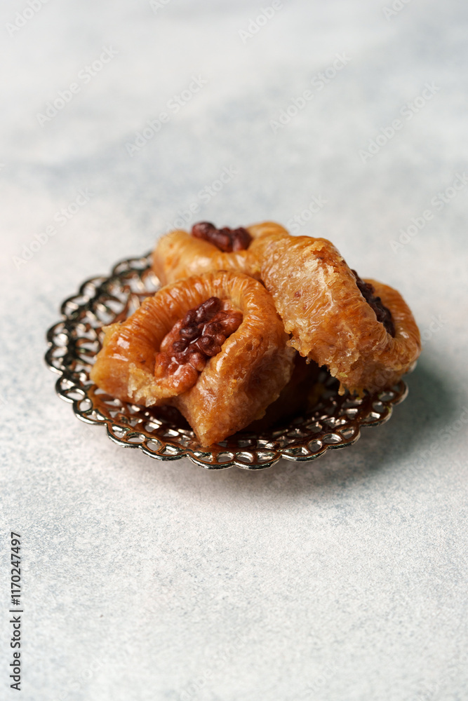 Delicious sweet pastries displayed on a decorative plate in a soft natural light setting