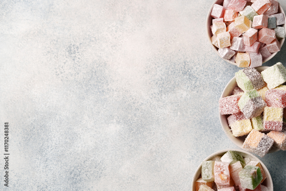 Delicious assortment of Turkish delight in bowls arranged on a light surface