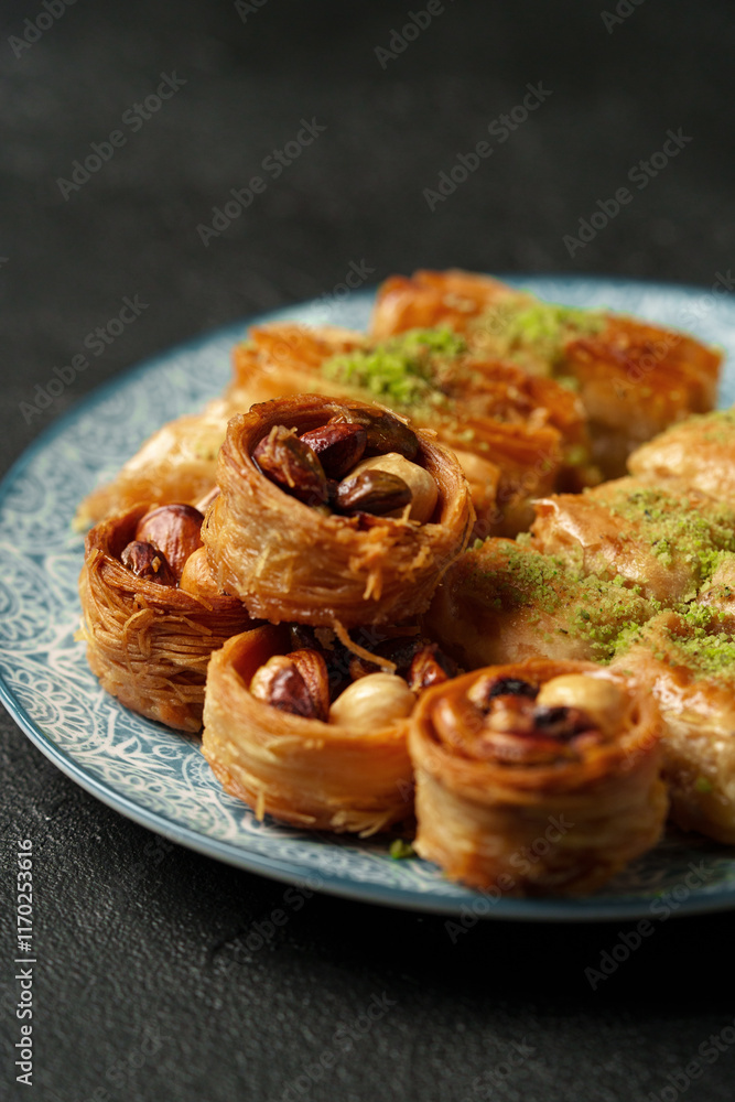 Traditional Middle Eastern sweets arranged on a decorative plate with nuts and syrup at a cultural gathering