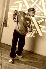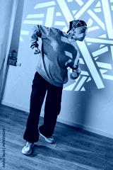 A man in a grey sweatshirt and black pants dances in a studio with a colorful light projection on the wall