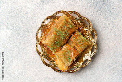 Delicious homemade baklava on a decorative gold plate ready to savor at a family gathering