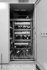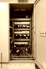 Interior view of a complex electrical panel containing numerous wires and circuits in a control room setting
