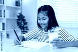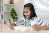 children women drink milk to nourish the body and nourish the brain. asian young little girl learn at home. girl happy drink milk and read a book for exam, Homeschool. education, vitamins, development