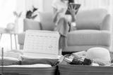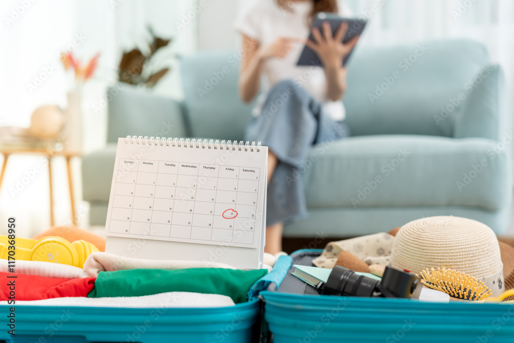 Holiday calendar for travel, Traveler, travel bag. choose country for travel. Asian Young women are prepare clothes and personal belongings. Pack your luggage before travel, Travel, life style