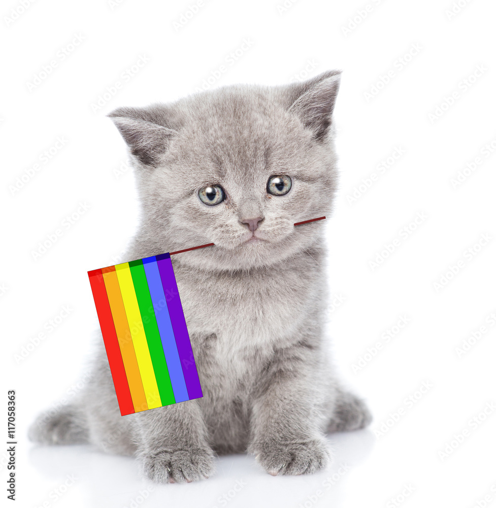 Cute kitten with rainbow color flag symbolizing gay rights. isolated on white