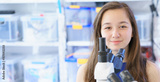 Teen girl in laboratory classes, banner horizontal format with free copyspace