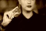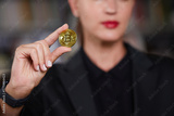 close up businesswoman holding and showing golden bitcoin cryptocurrency on hand