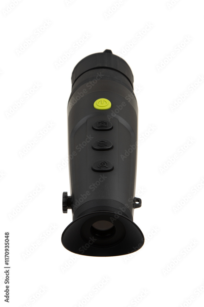 Thermal imaging monocular with lens cap, black body, multiple control buttons, and ergonomic design, ideal for night vision and outdoor activities. Isolate on white back