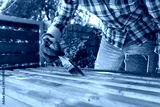 Close-up of a worker’s gloved hand painting a wooden surface with a brush and stain during an outdoor DIY renovation project
