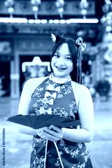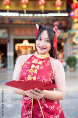 Portrait smiles Asian young woman wearing red cheongsam dress holding red envelopes decoration for Chinese new year festival celebrate culture of china at Chinese shrine Public places in Thailand