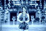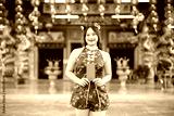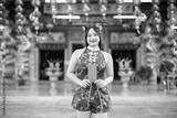 Portrait smiles Asian young woman wearing red cheongsam dress holding red envelopes decoration for Chinese new year festival celebrate culture of china at Chinese shrine Public places in Thailand