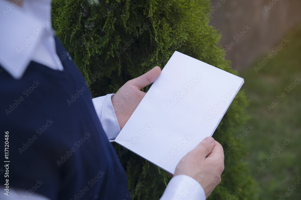Mockup cover magazine, catalog, book. Man reading a blank magazine, catalog, book on the bench.