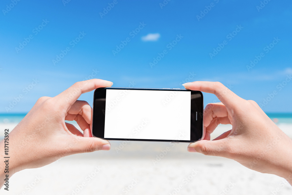 Stock Photo: woman's hand using smart phone at beach. Smartphone white screen at sea. Girl using black color smartphone at Beach from Thailand.