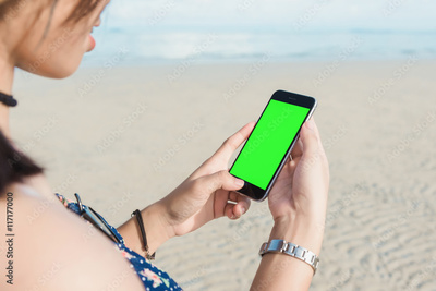 Beautiful woman's hand using smart phone at beach. Smartphone green screen. Asia woman hand holding using smartphone.