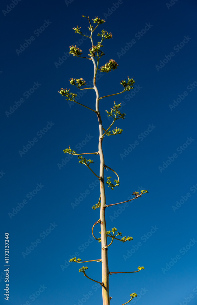 Blooming Yucca Stalk Against Dark Blue Sky