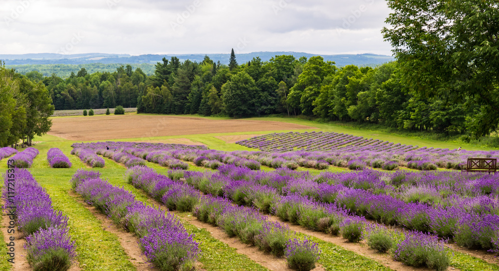 a field of lavender plants in full bloom in rows